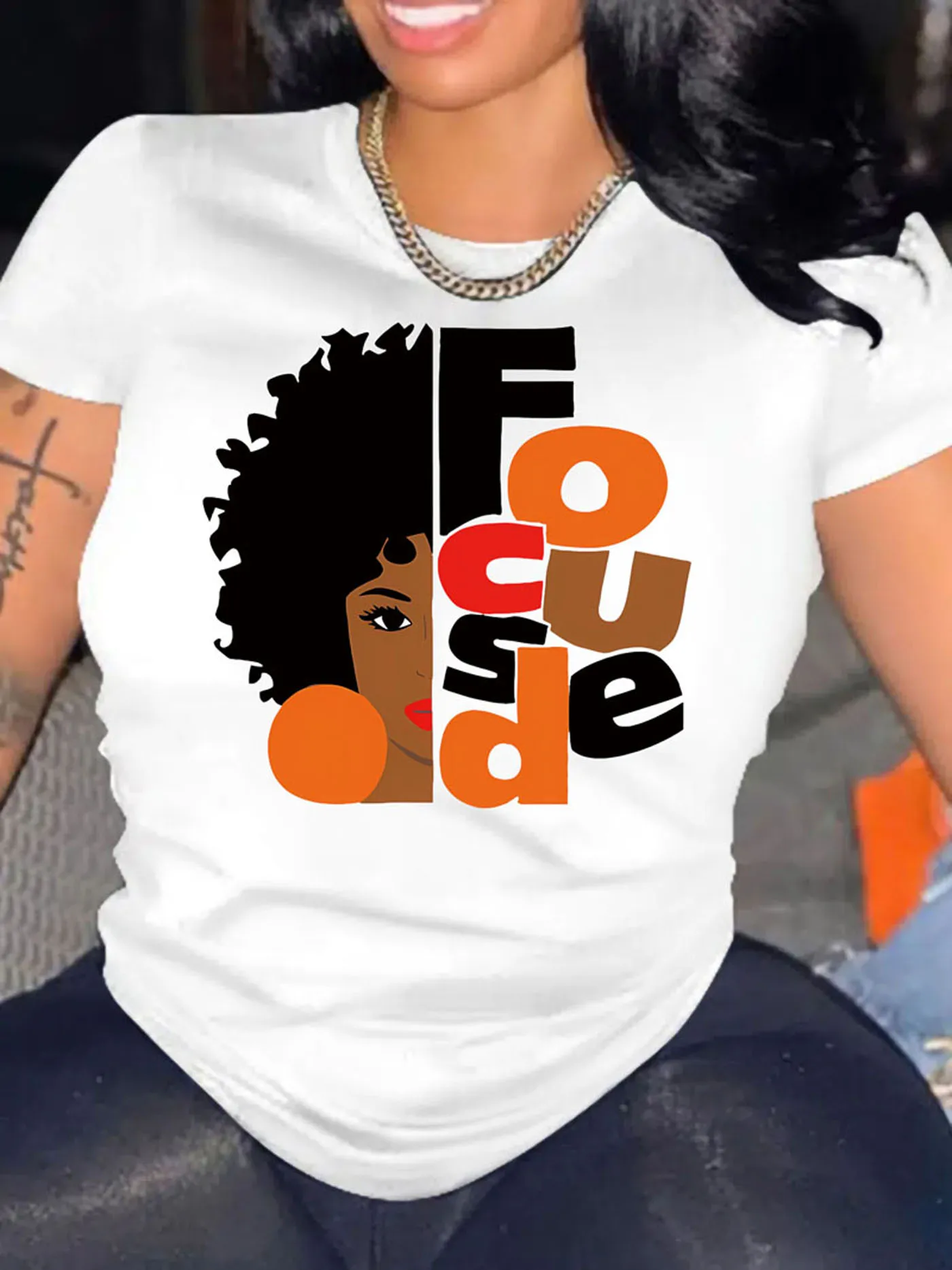 Women's Focused Black Melanin Woman Graphic Print T-Shirt - Empowering Afro Silhouette & Bold Lettering