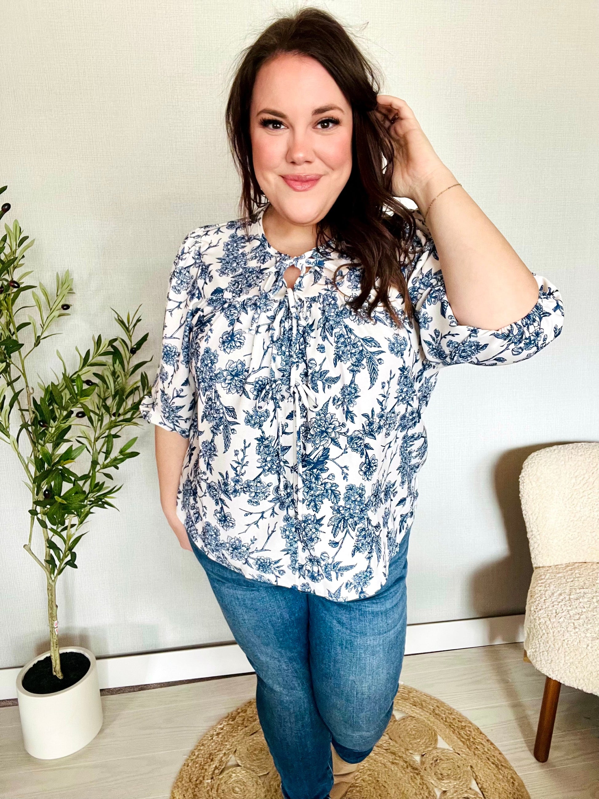 Vintage Vibes Floral Ribbon Tie Bows Three-Quarter Sleeve Top